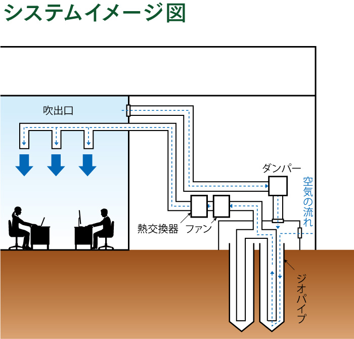 株式会社西尾組様(西尾武博代表取締役)は静岡県富士市の総合建設業者でGEOパワーシステム施工会員。令和2年、鉄骨造2階建の同社事務所1階部分にGEOパワーシステムの大型循環システムを導入し、事務所を訪れる一般の方々にも地中熱が体感出来る施設として常時営業されています。社員は全20人で、事務職スタッフを含め常時数人が終日室内にて仕事に従事しておられます。